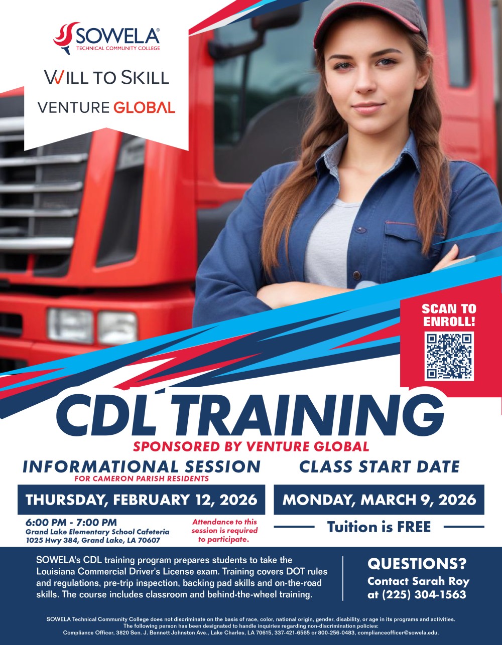SOWELA’s CDL training program prepares students to take the Louisiana Commercial Driver’s License exam. Training covers DOT rules and regulations, pre-trip inspection, backing pad skills and on-the-road skills. The course includes classroom and behind-the-wheel training.